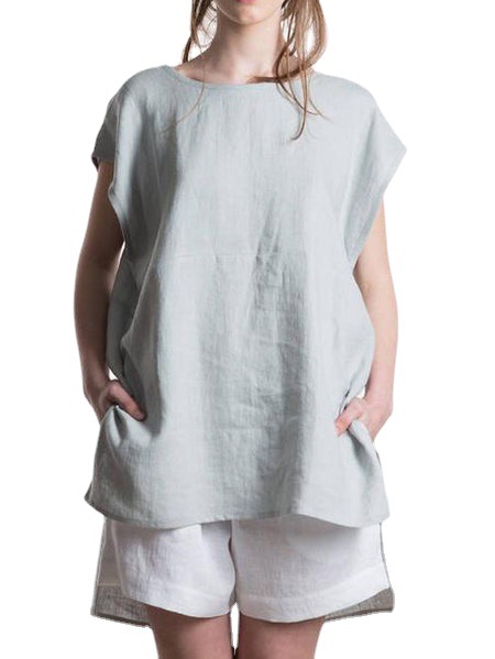 Cotton and Linen Top Front Short Back Length Batwing Short Sleeve T-shirt